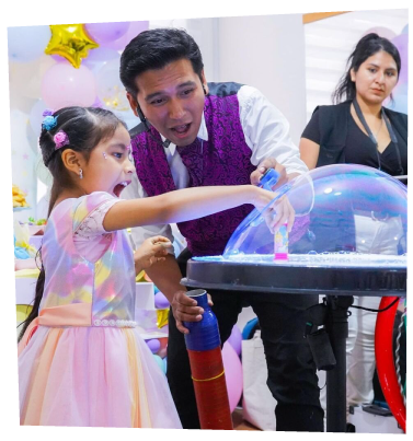 Disfruta de la gran carisma y experiencia del mago, donde todos los pequeños se asombrarán con cada obra de magia que nuestro mago ha preparado especialmente para tus pequeñines. Disfruta de un show de magia diferente donde el factor sorpresa no faltará.
